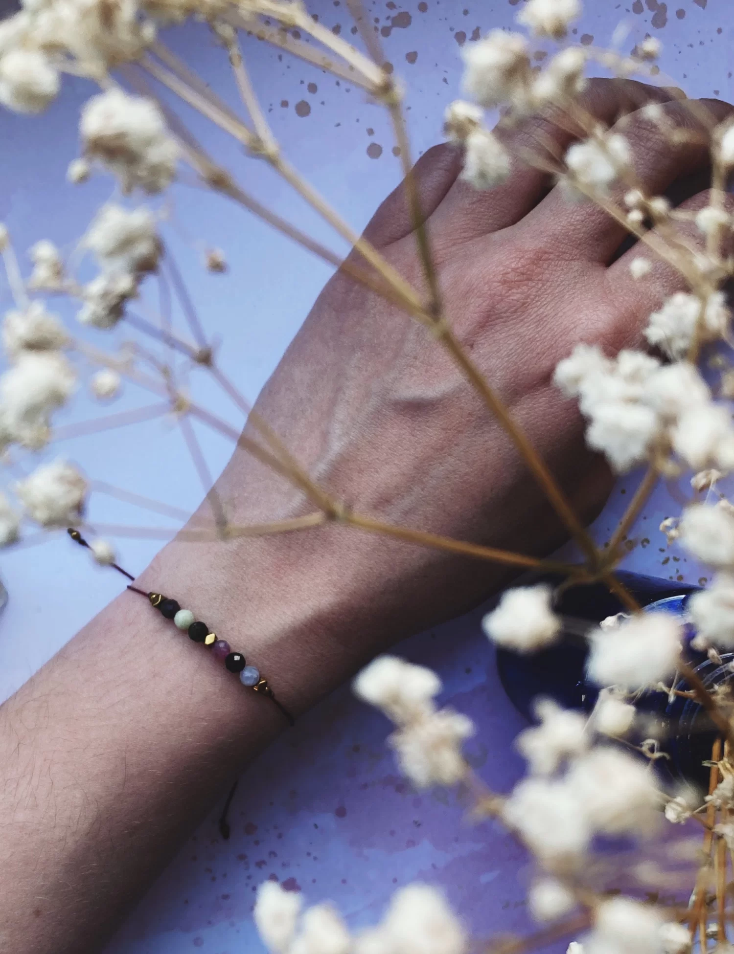 Bransoletka z turmalinem i hematytem na bordowym sznureczku