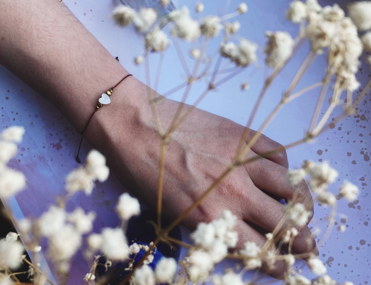 Bransoletka z serduszkiem z masy perłowej i hematytem na bordowym sznureczku