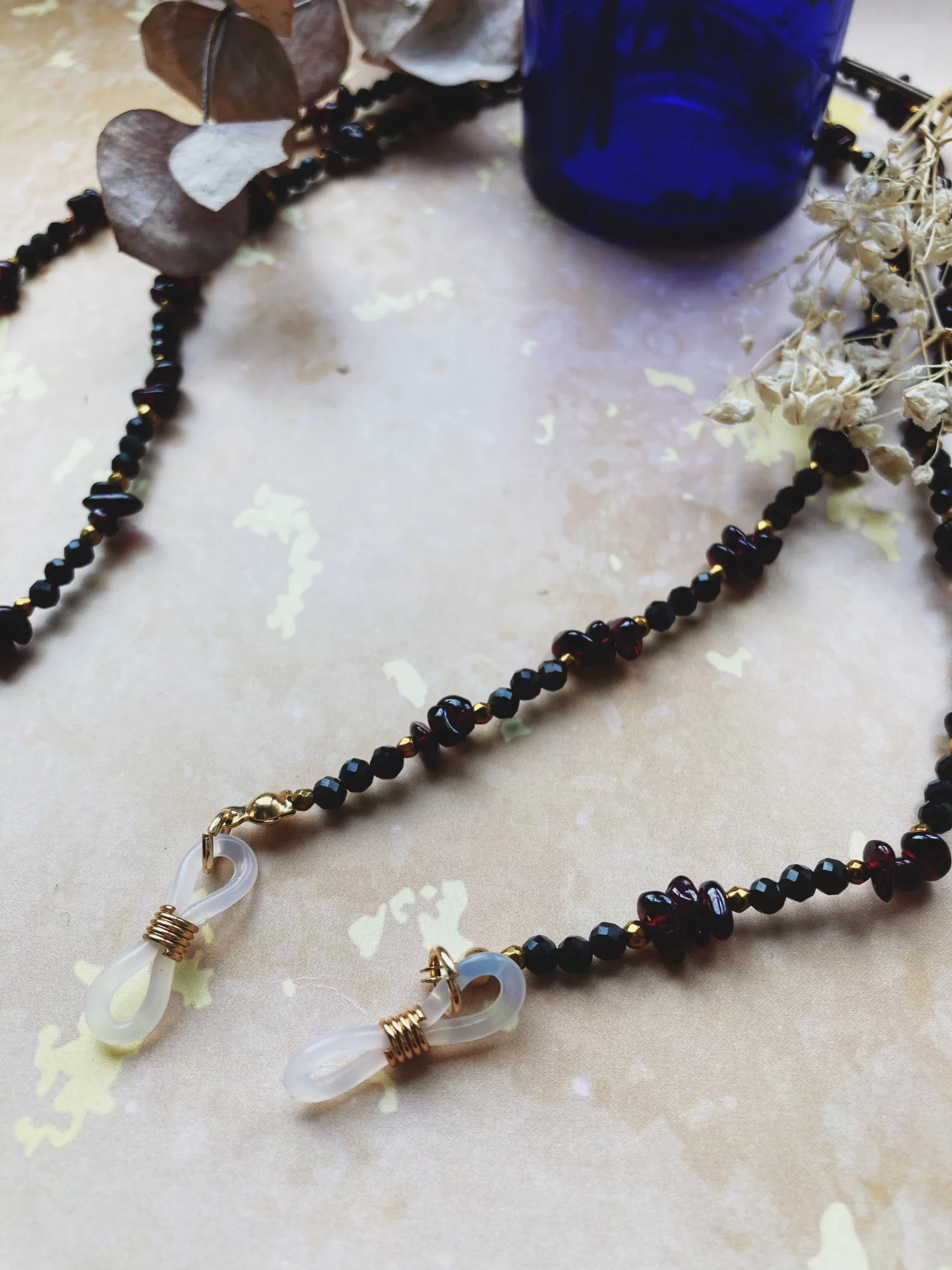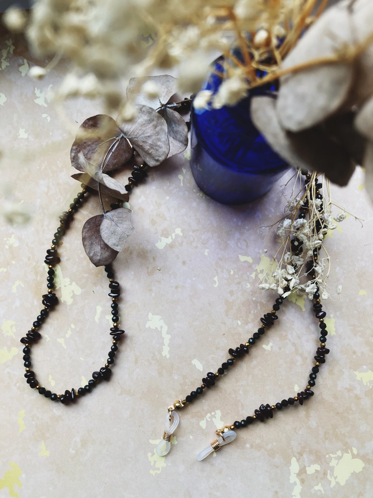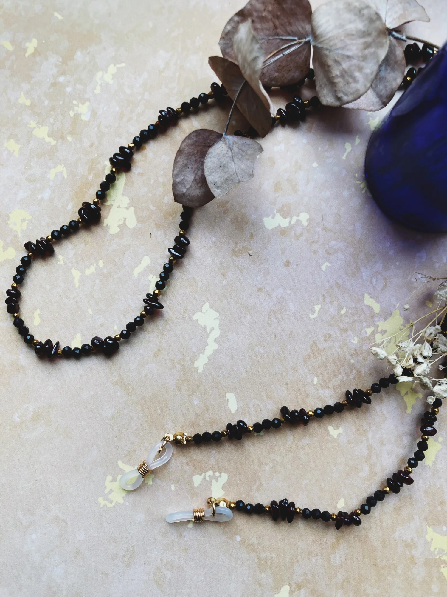 Łańcuszek do okularów, obsydian, granat i hematyt