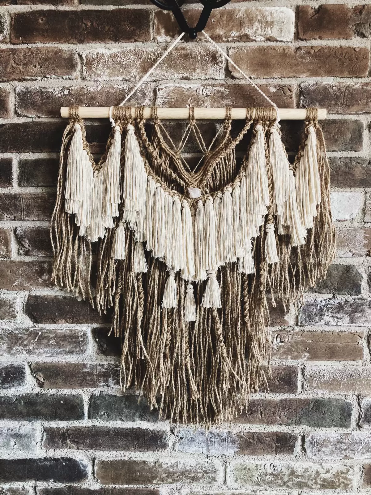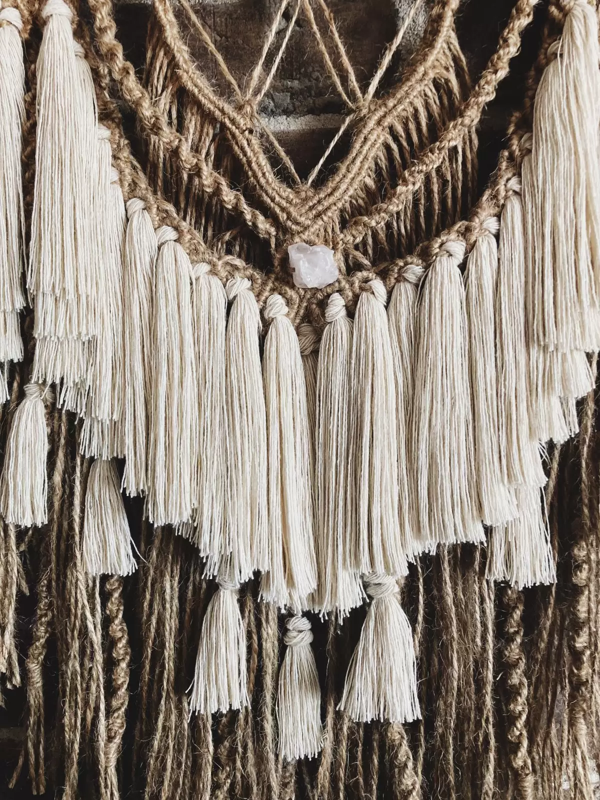 Makrama ze sznurka jutowego i bawełnianego ozdobiona bryłką kwarcu różowego