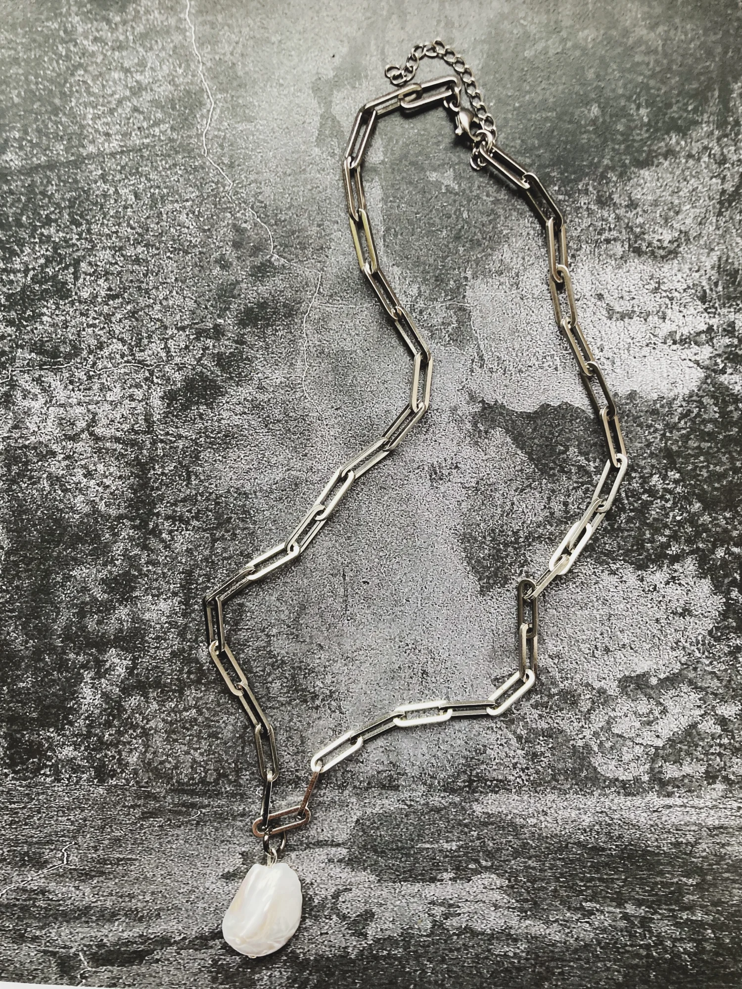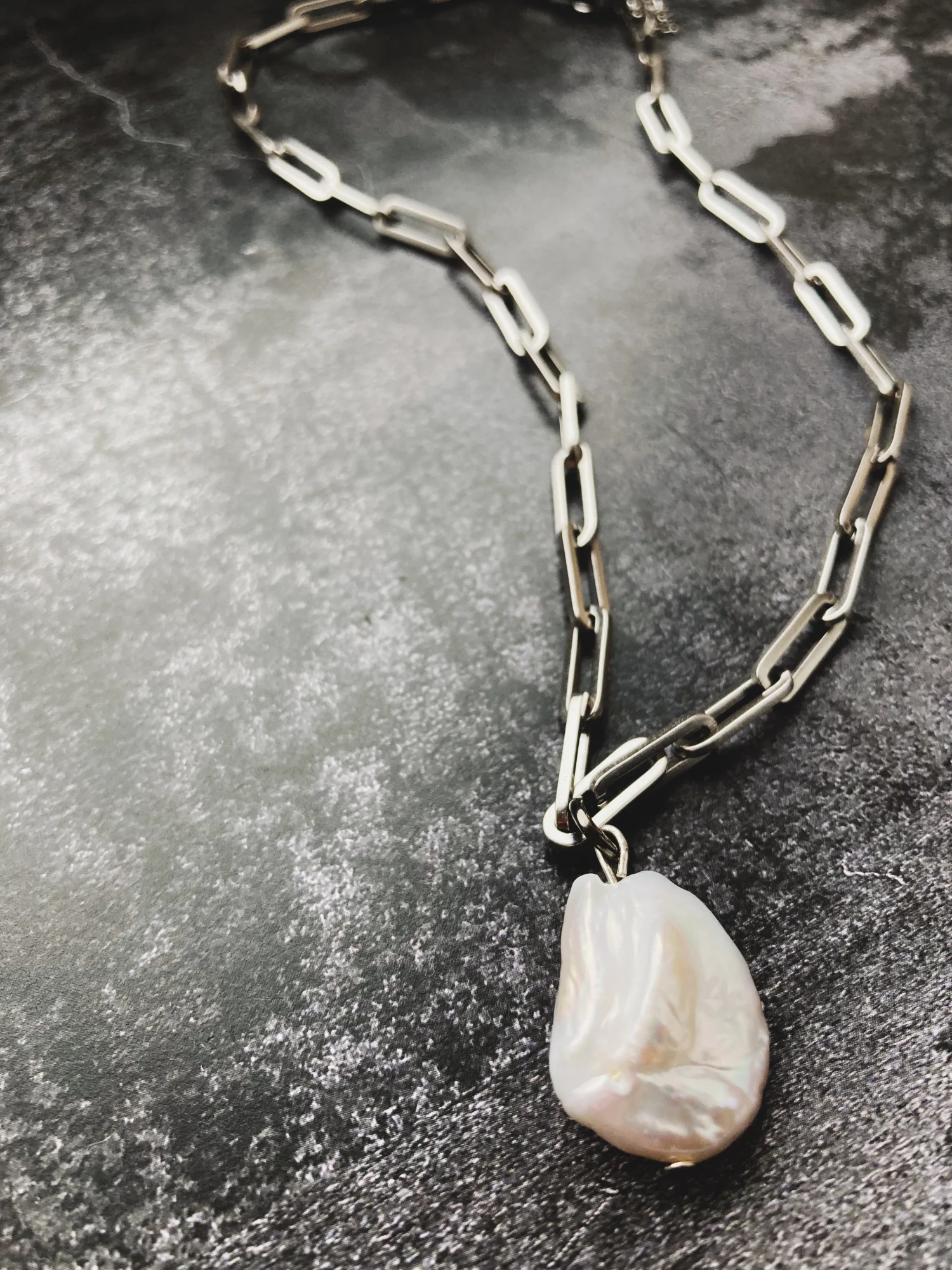 Naszyjnik z perłą barokową na łańcuszku typu ankier z dużymi oczkami ze stali chirurgicznej
