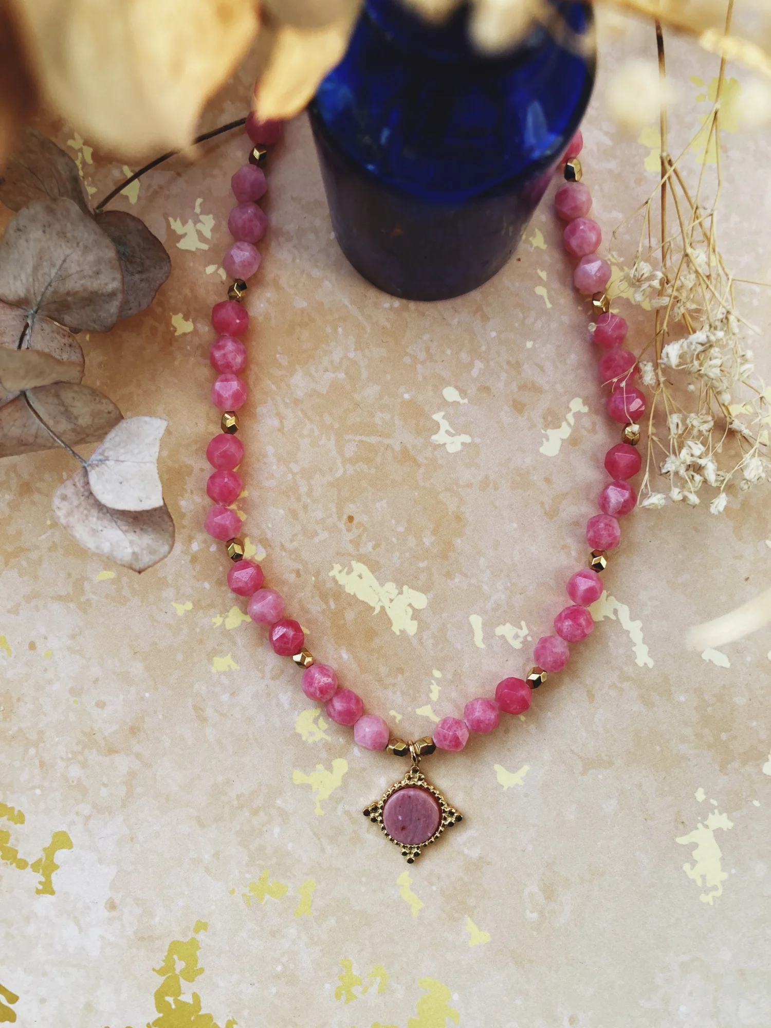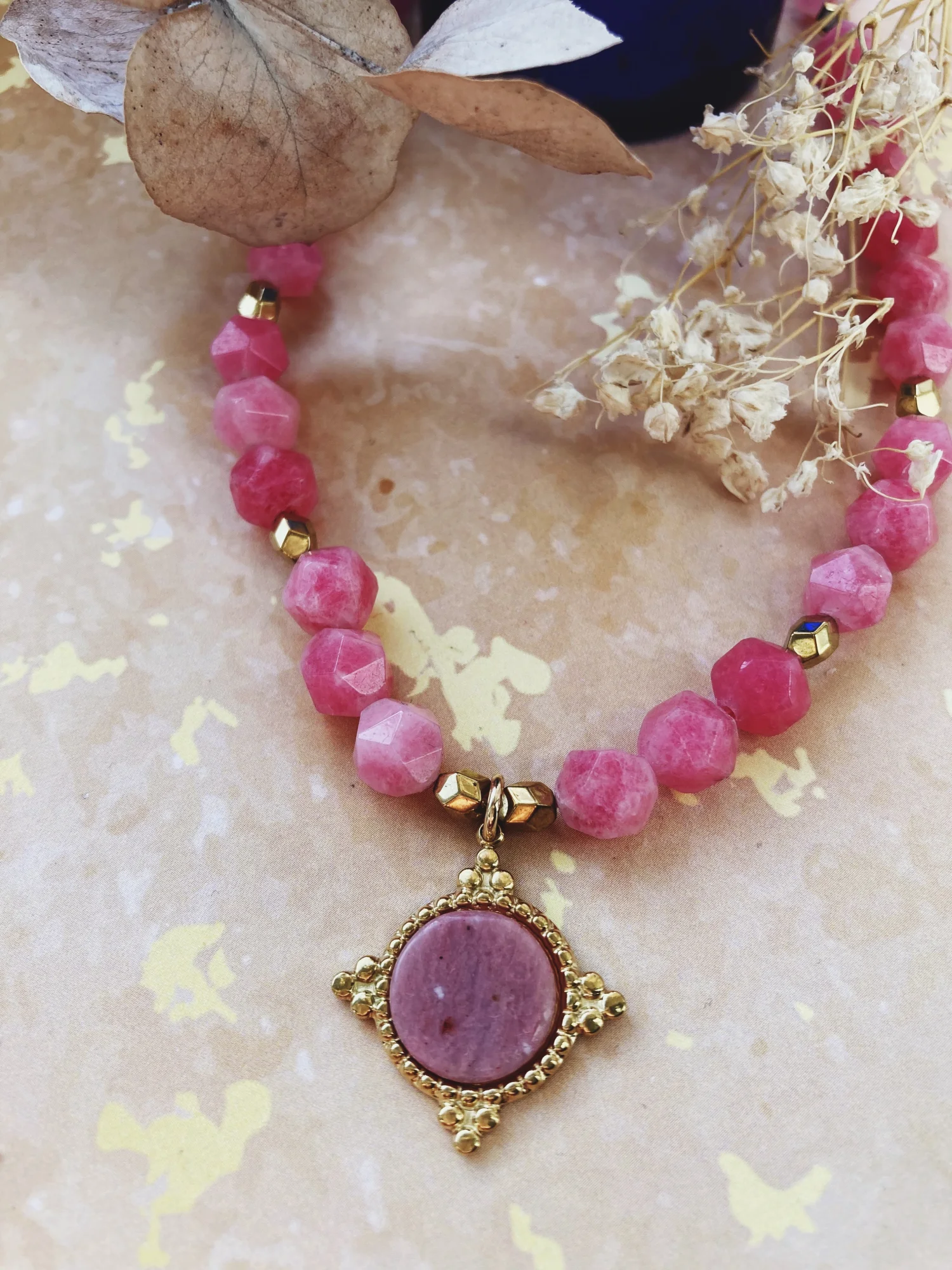 Naszyjnik z różowym chalcedonem, hematytem i zawieszką z rodonitem