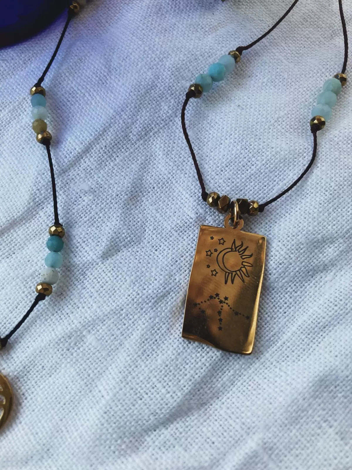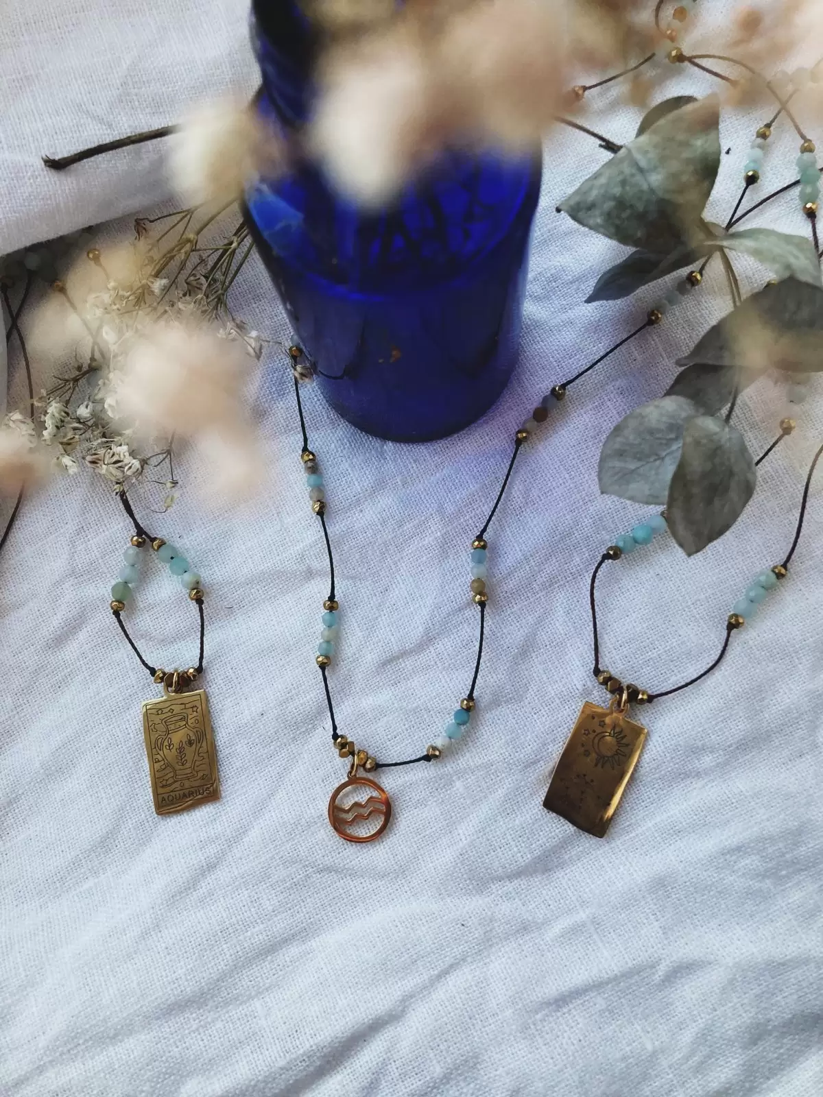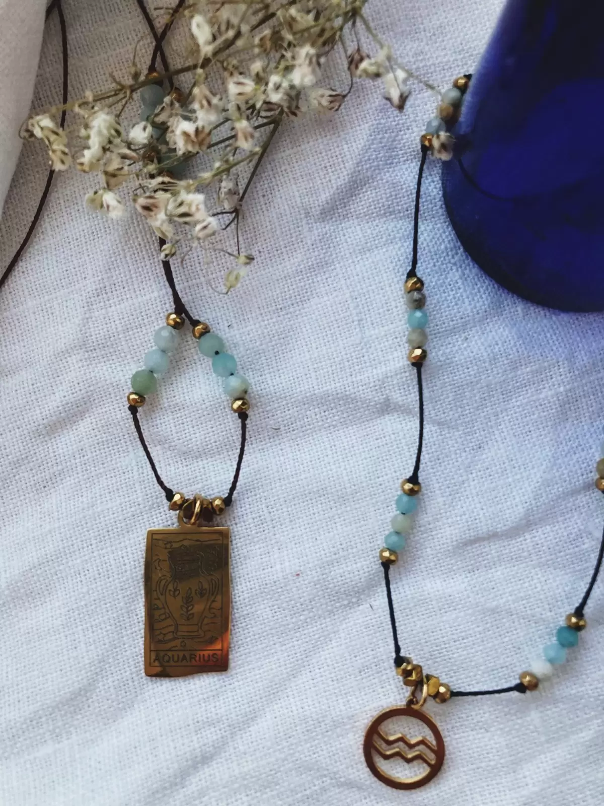 Naszyjnik z zawieszką ze stali chirurgicznej ze znakiem zodiaku Wodnik z koralikami akwamaryn i hematyt