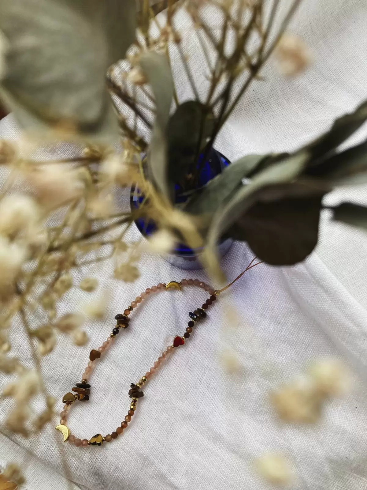 Bransoletkowa zawieszka do telefonu, tygrysie oko, agat, kamień słoneczny i hematyt